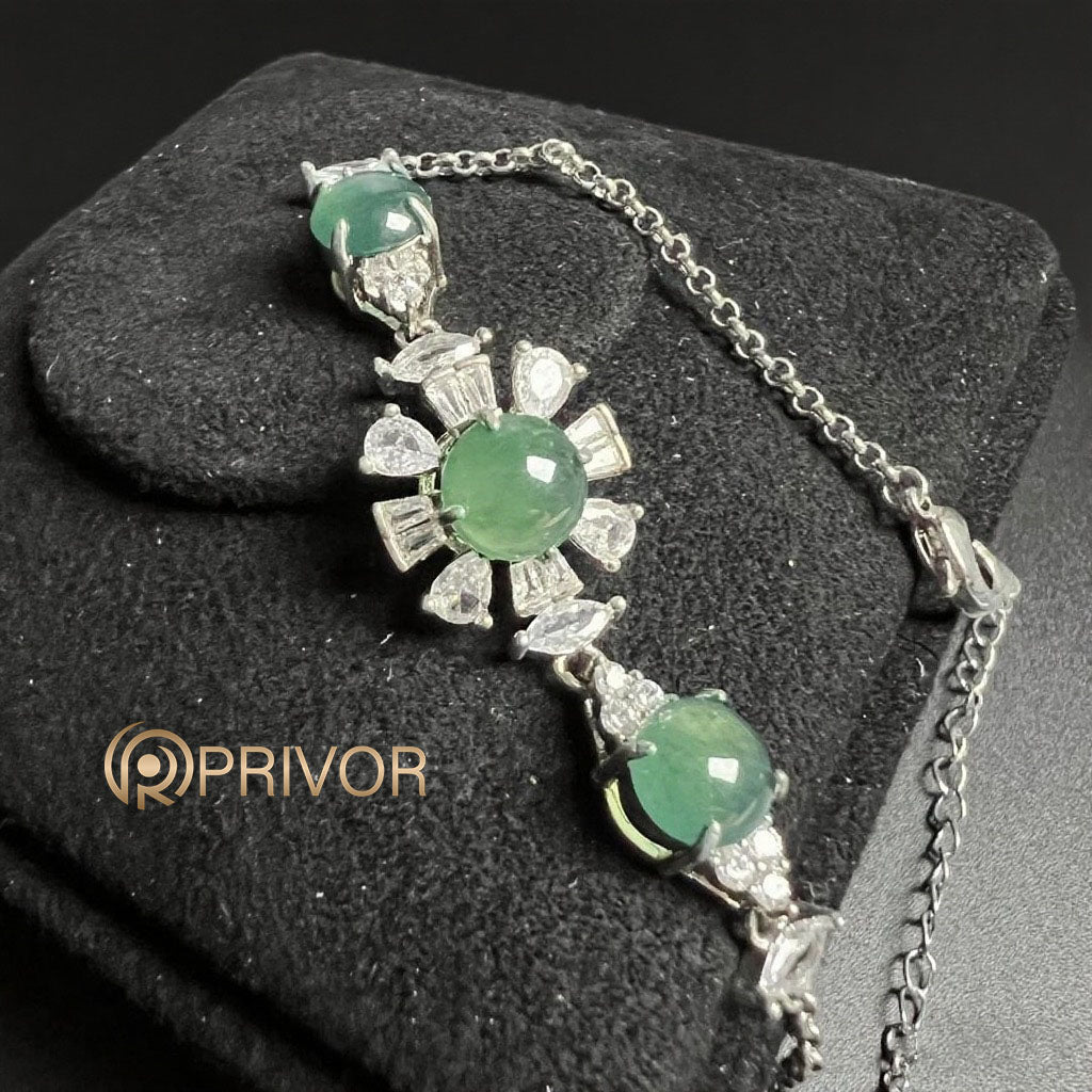 This Three-cabochon bracelet strings glowing emerald jadeite rounds like celestial bodies in motion. Sleek, minimal, yet rich with cultural roots — a stunner in every flick of the wrist.
