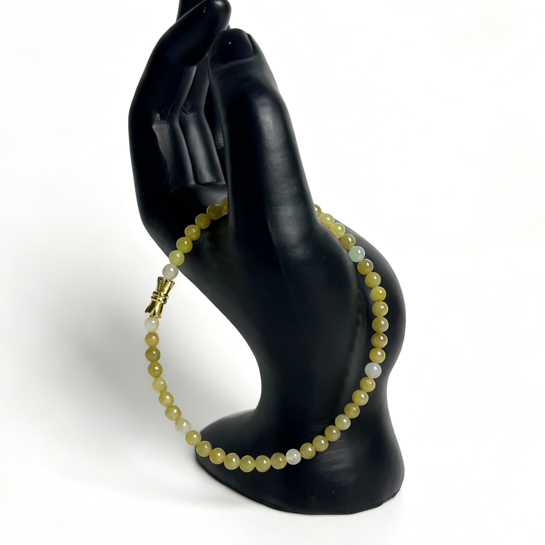 This olive-yellow jadeite bracelet glows with gentle sunlight tones, symbolizing prosperity and vitality. The subtle sheen complements all skin tones, creating a refreshing, modern charm that stands out beautifully in daylight or candlelight.