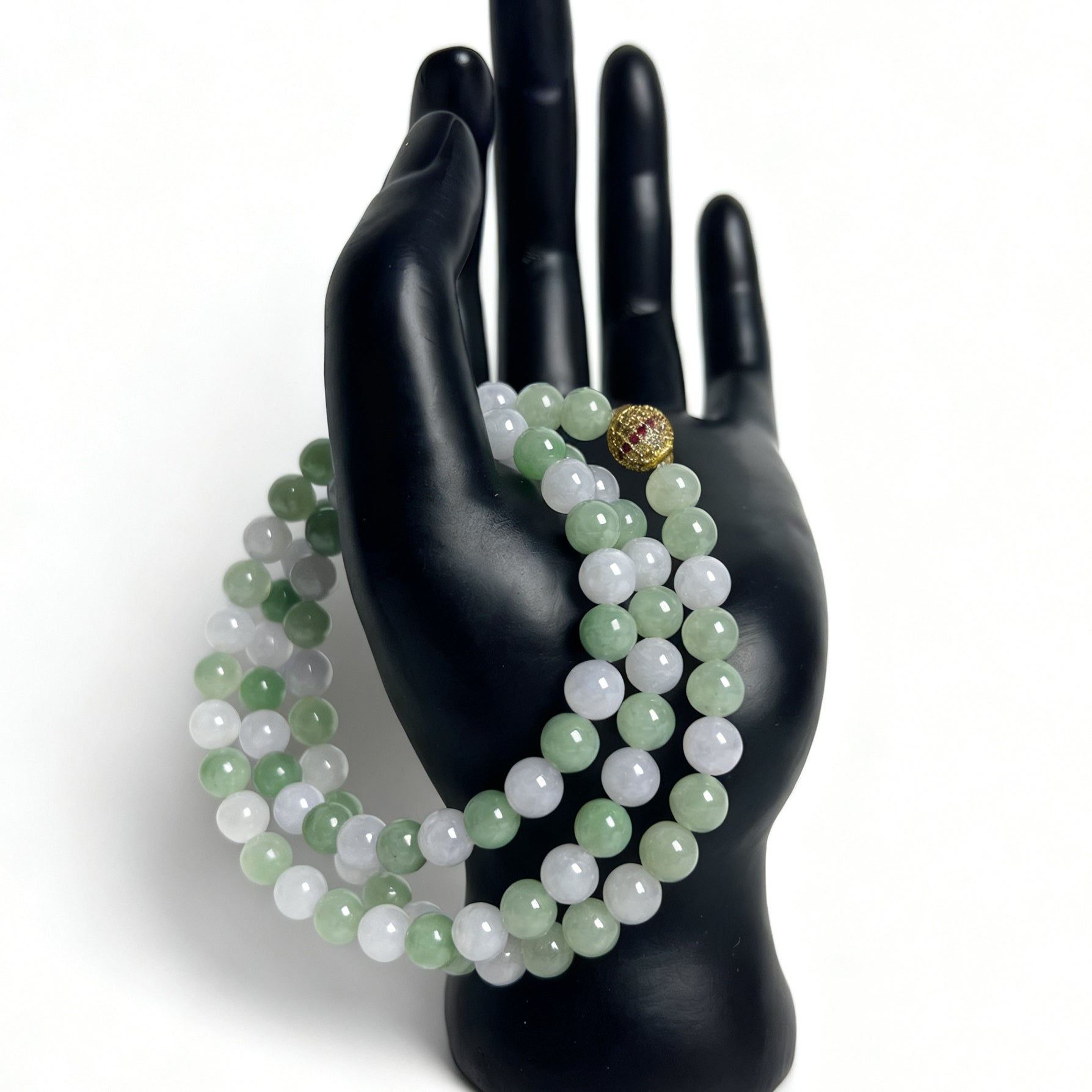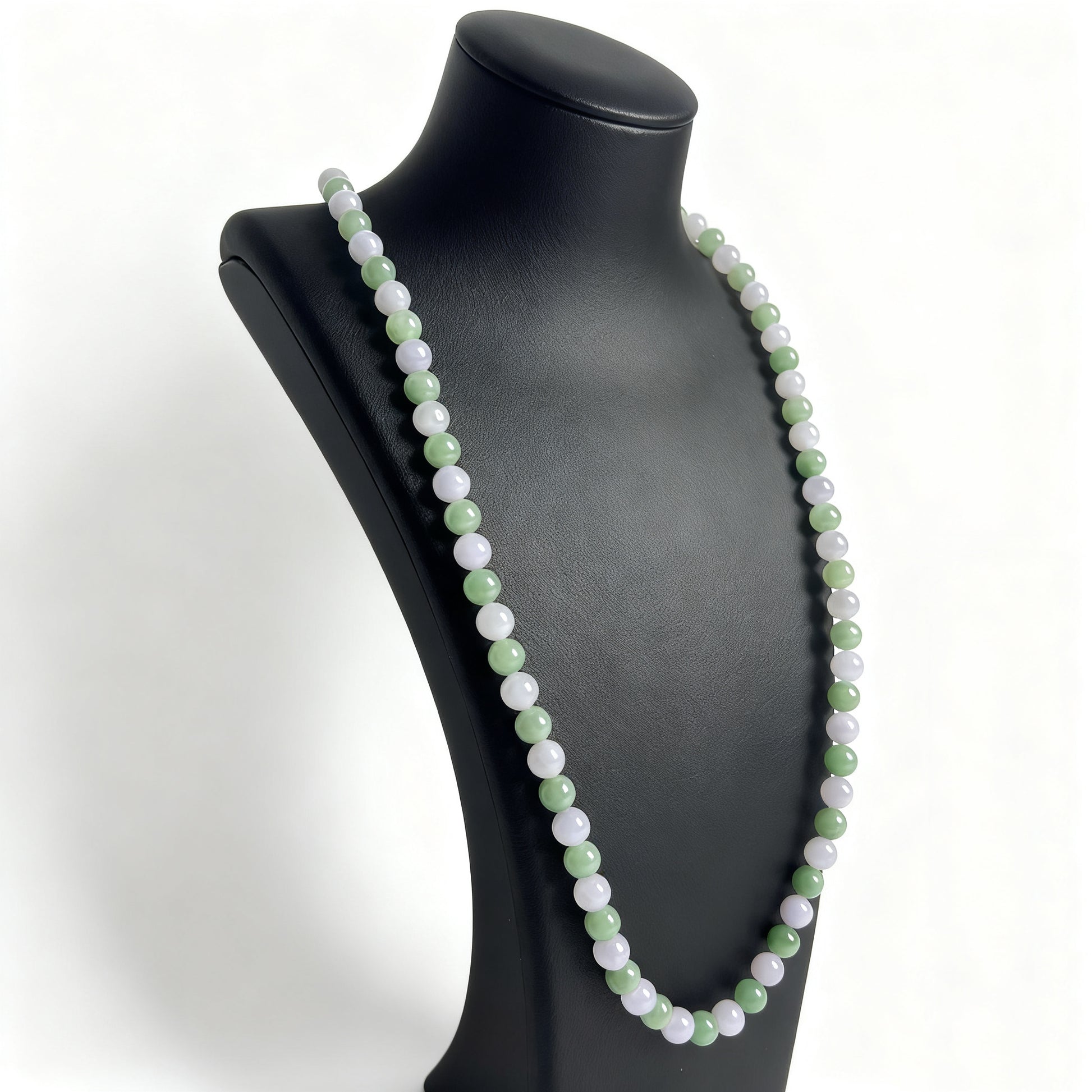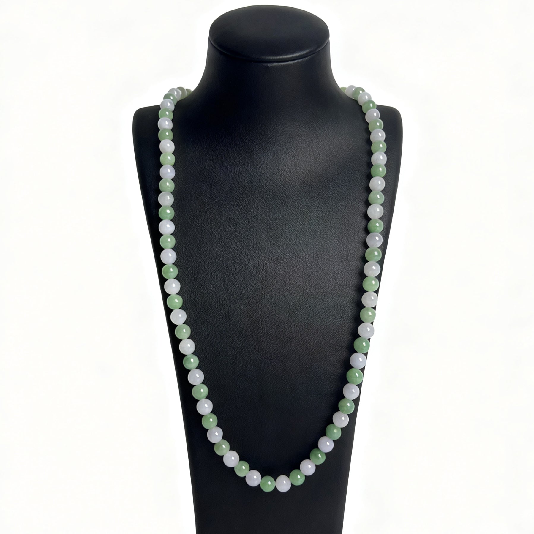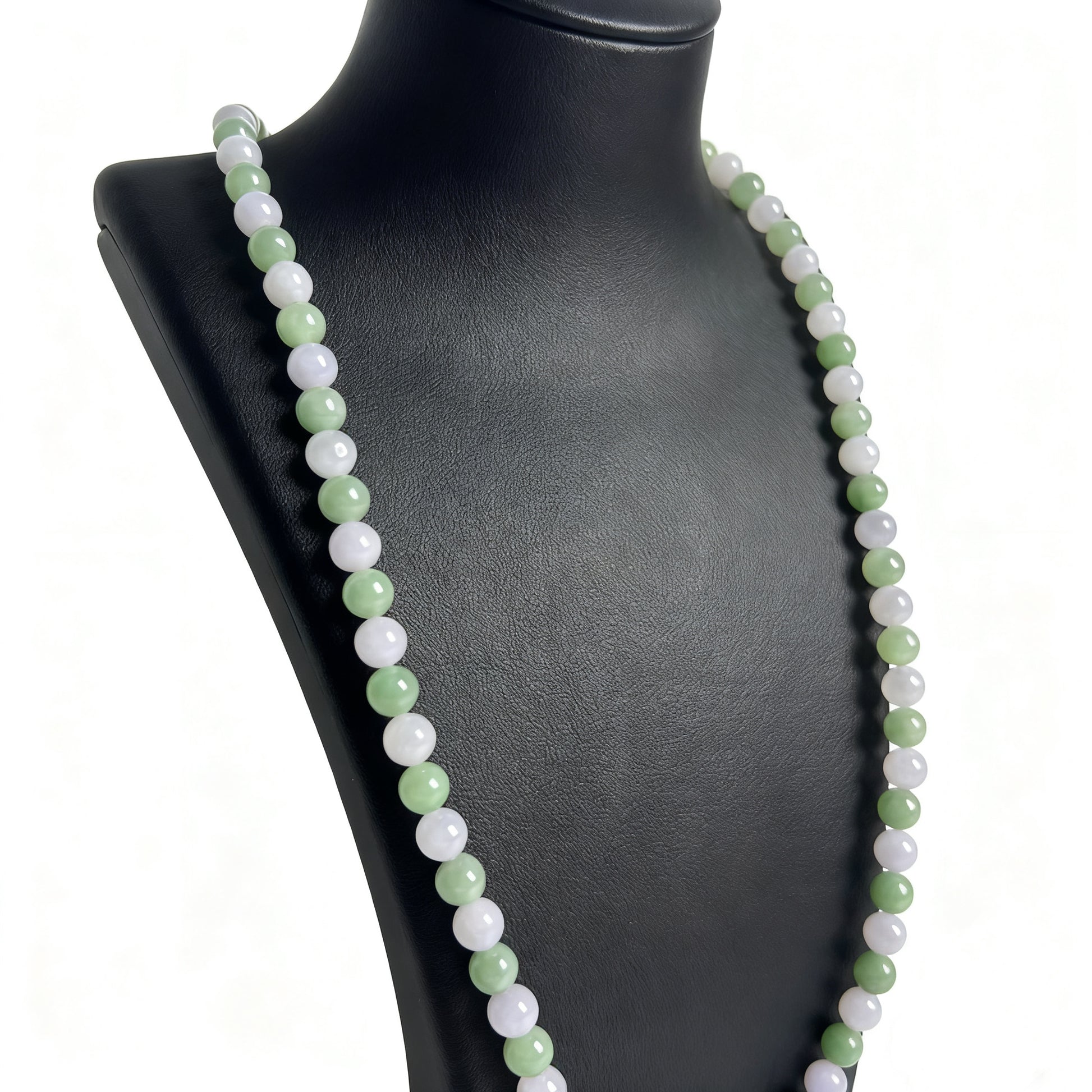 Soft lavender and pale green jadeite beads merge gracefully in the Lilac Whisper Necklace, radiating an aura of serenity and gentle charm. The pastel tones dance with light as you move, exuding a polished yet soothing beauty — an ideal choice for those who appreciate elegance with a poetic touch.