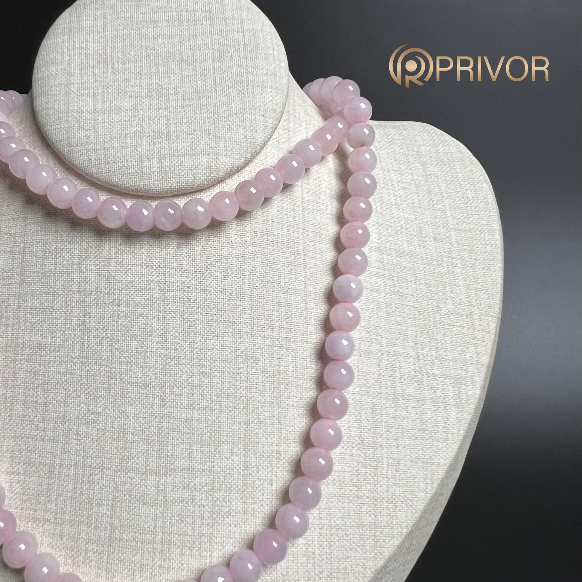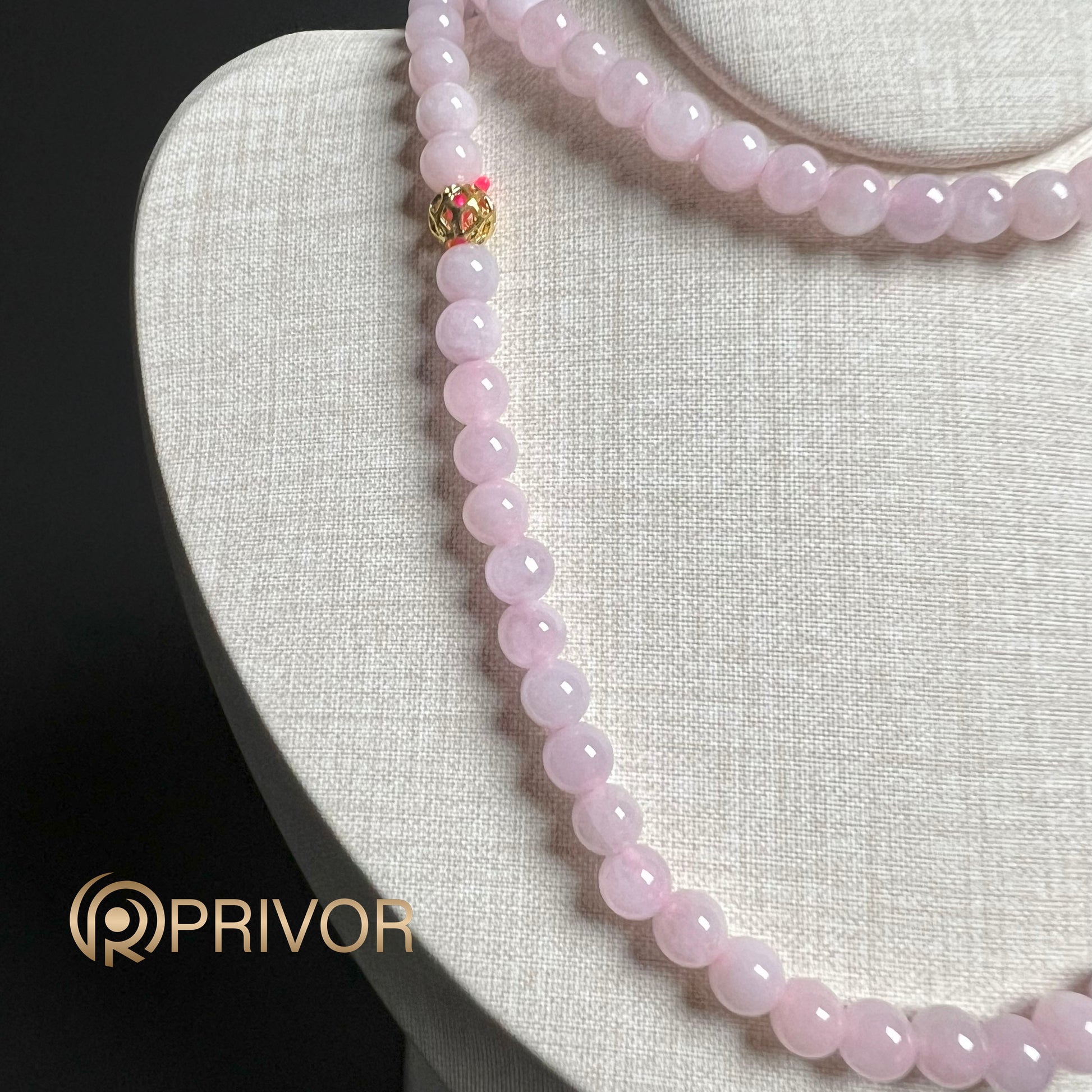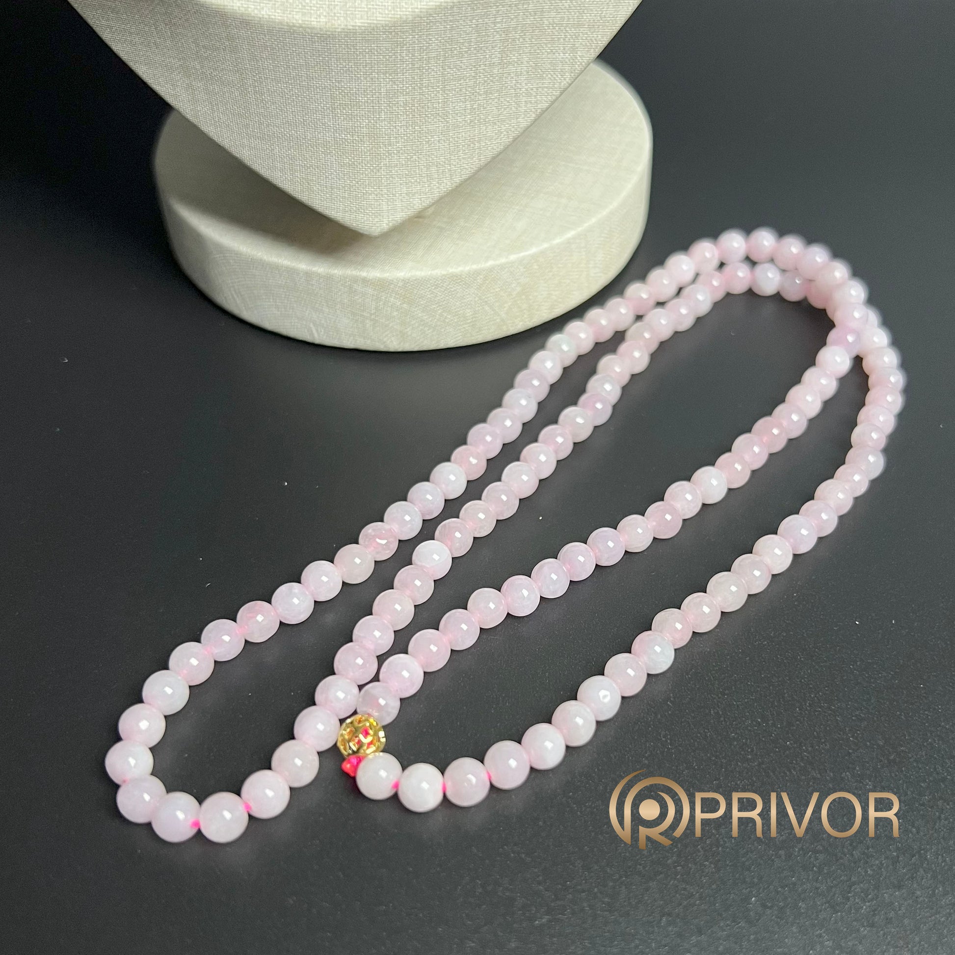 114 pinkish jadeite beads strung into a graceful necklace (A versatile design that transition to be a three-round bracelet) — feminine, calming, and effortlessly chic. A lovely contrast to jade green, perfect layered or solo.
